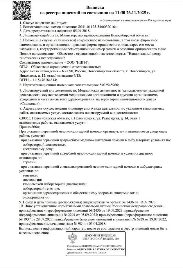 Молекулярно-генетический центр «ДТЛ» является официальным представителем лаборатории ООО «ИнЛаб Генетикс» («InLab Genetics») в Ковылкино. Все ДНК тесты проводятся на основании медицинской лицензии: № Л0-41-01148-78/00644845 от 23.03.2023 г..